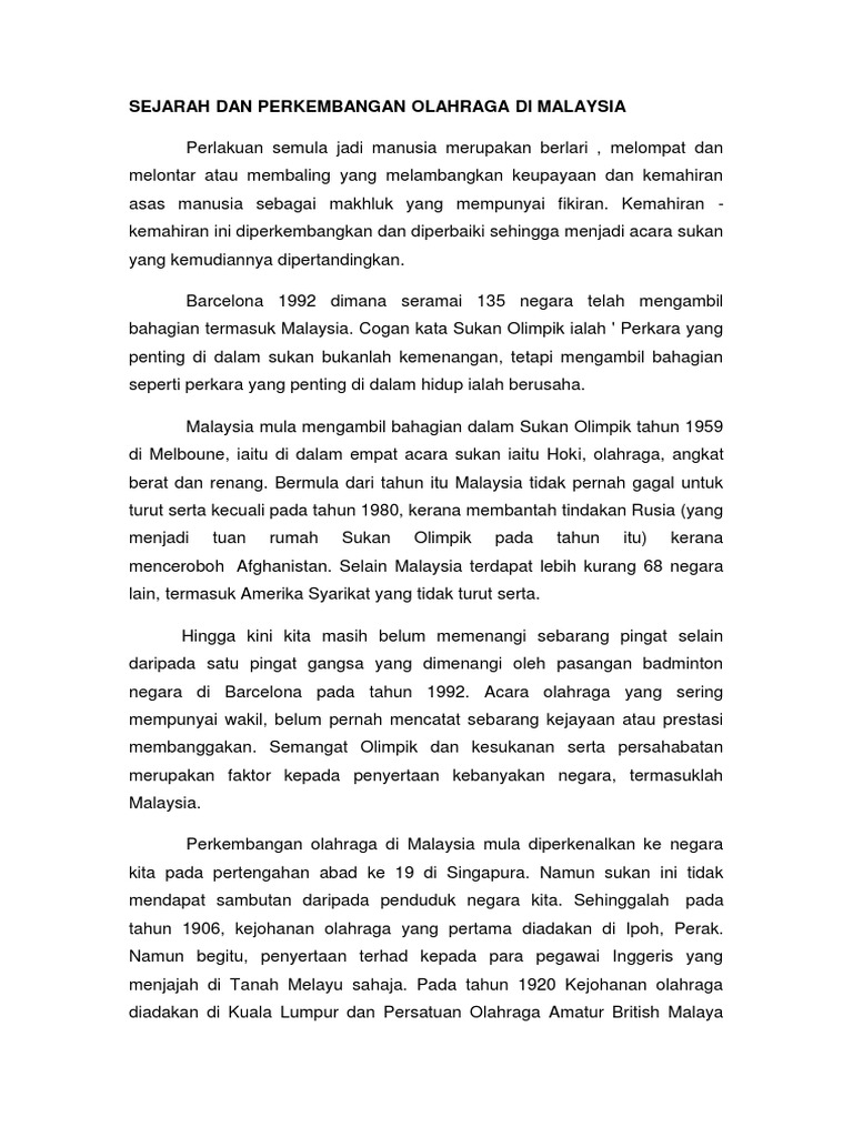 Sejarah Dan Perkembangan Olahraga Di Malaysia Docx from imgv2-2-f.scribdassets.com Sukan petanque diperkenalkan di negara malaysia pada tahun 1987 oleh kementerian belia dan sukan. Sarah chung pit jin adalah bintang terbesar didalam sukan taekwondo yang pernah dilahirkan di negara malaysia. Rakyat malaysia dari pelbagai lapisan masyarakat menyertai pelbagai sukan untuk rekreasi dan persaingan. Sukan yang berpotensi dan boleh dimajukan. Sukan di malaysia adalah bahagian penting dalam budaya malaysia. Sukan di malaysia malaysia mula mengambil bahagian dalam sukan olimpik tahun 1959 di melboune, iaitu di dalam empat acara sukan iaitu hoki, olahraga, angkat berat dan renang. Perkembangan dan sejarah sukan di malaysia. Panduan malaysia maklumat terkini skema jawapan nasionalisme di malaysia.